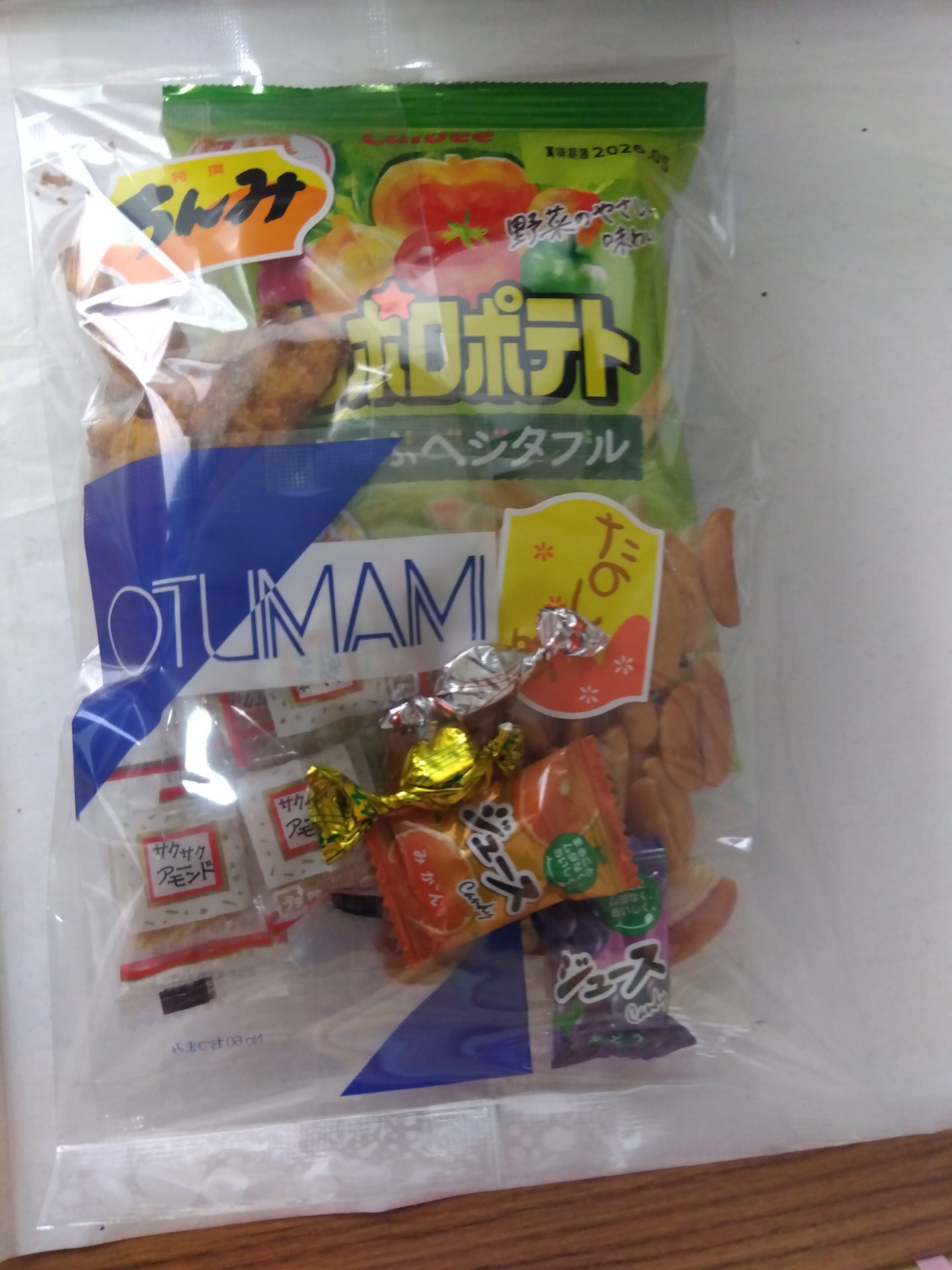 ソフトスルメ・おつまみチョコ(or珍味)・ スナック菓子(小袋)・柿ピー・ イカフライ・海苔巻きおかき・ アーモンドクッキー・マグロ珍味・ サラダあられ